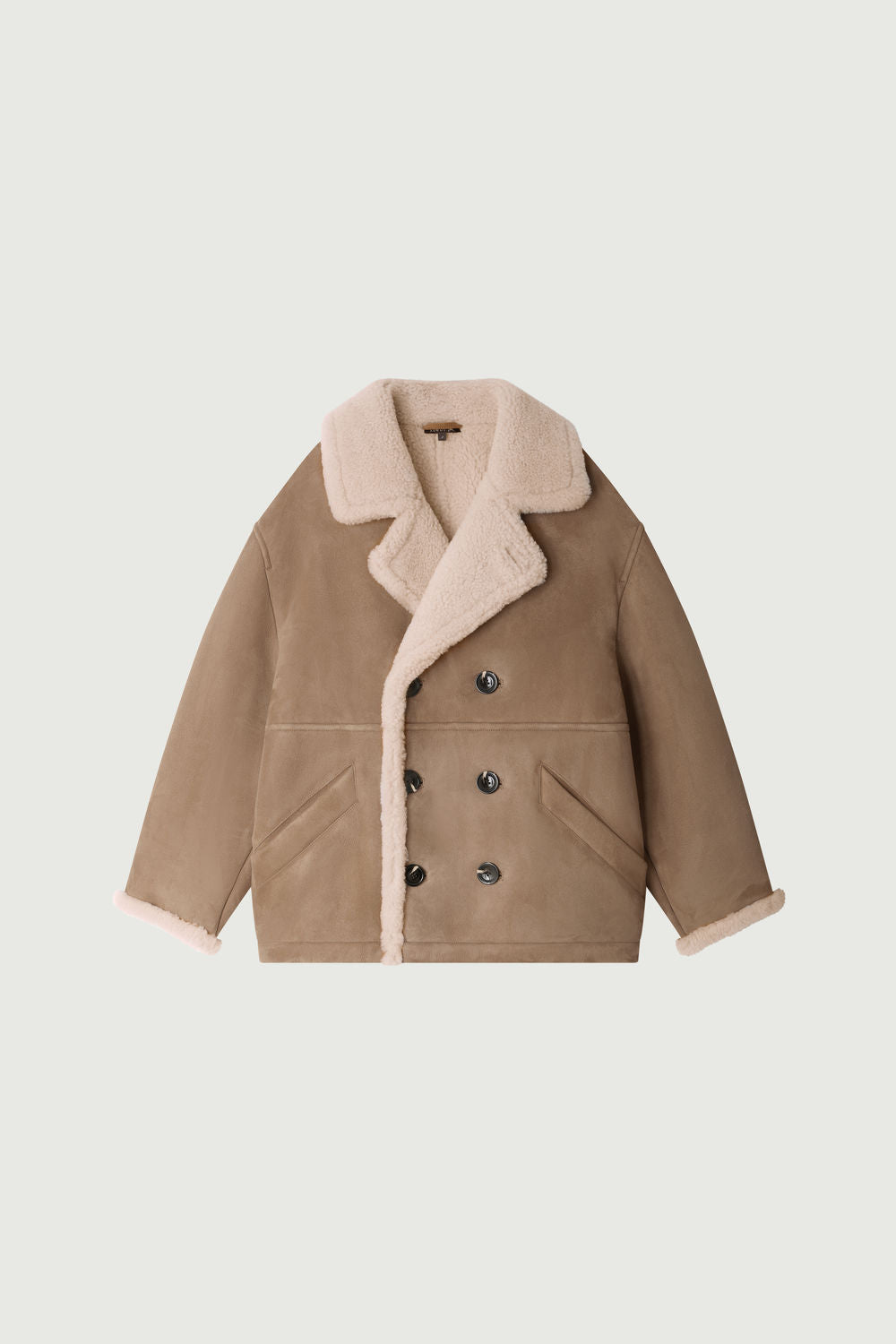 BONN is a beige shearling coat. Its generous, cropped silhouette fastens with a double-breasted closure. Crafted from suede lamb leather, it provides optimal protection against the cold while offering exceptional softness with its shearling interior.